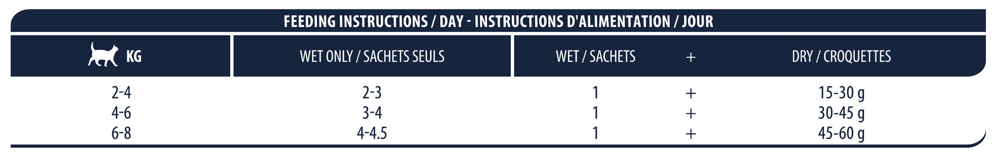 ŠĖRIMO INSTRUKCIJA: Šėrimo norma yra nurodyta ant pakuotės, reiktų atsižvelgti į kūno svorį ir aktyvumą. Laikyti vėsioje, sausoje vietoje. Patiekti kambario temperatūros. Atidarius laikyti šaldytuve iki 2 parų. Visada turi būti švaraus vandens.