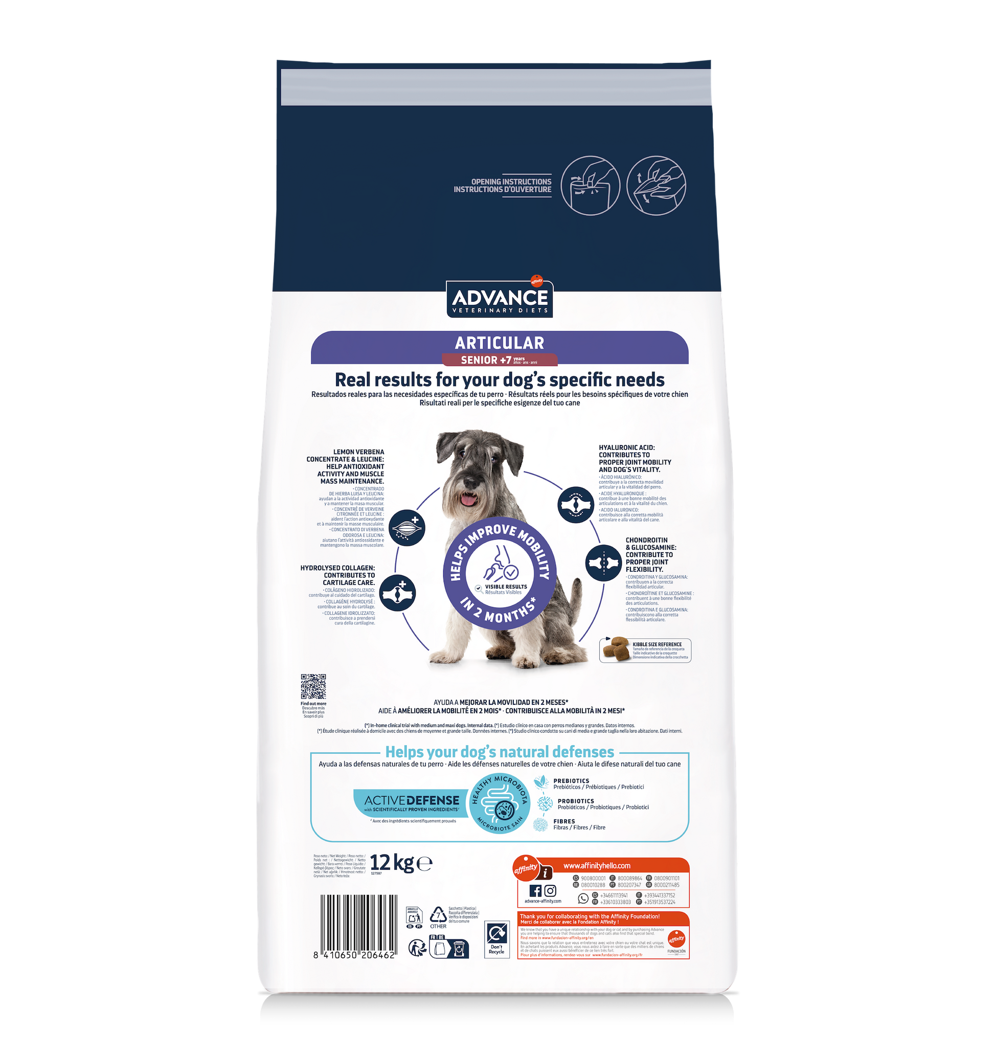 „Advance Veterinary Diets ARTICULAR SENIOR“ yra visavertis subalansuotas šunų pašaras, skirtas vyresniems nei 7 metų amžiaus šunims, turintiems sąnarių problemų.