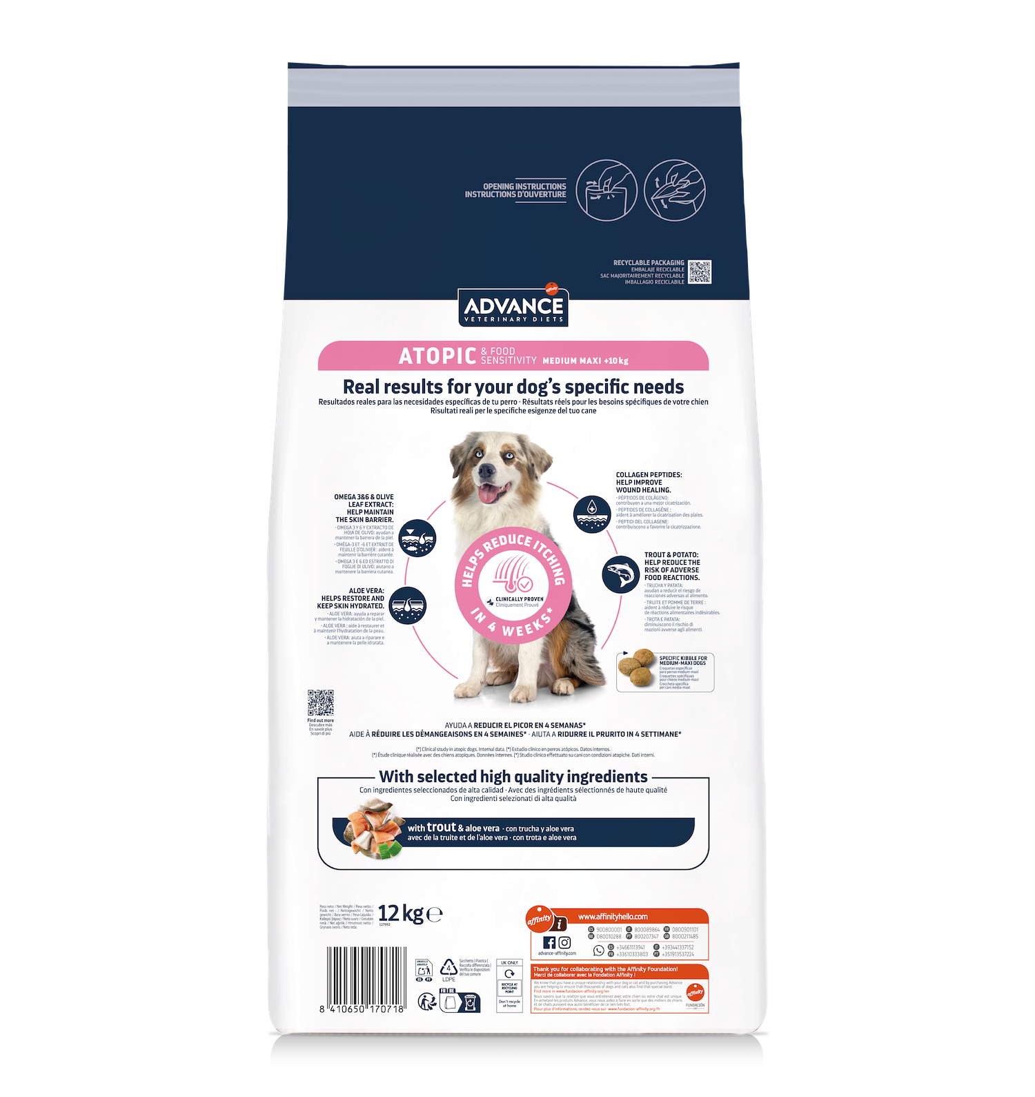 Advance Veterinary Diets ATOPIC medium/maxi yra dietinis visavertis pašaras suaugusiems vidutinių ir didelių veislių šunims, kurio sudėtyje yra didelis kiekis linolo rūgšties (LA), eikozapentaeno (EPR), dokozaheksaeno rūgšties (DHR), odos funkcijoms palaikyti, kai sergama dermatoze ir sparčiai slenkant kailiui, su atrinktais ir riboto kiekio baltymų šaltiniais, mažinančiais ingredientų ir maistinių medžiagų netoleravimą.