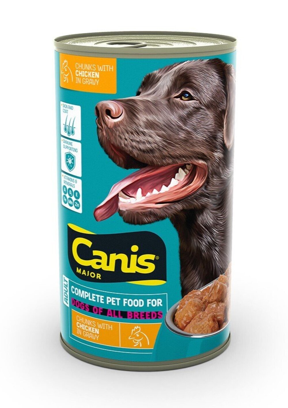 Canis Major visavertis konservuotas ėdalas visų veislių suaugusiems šunims, gabaliukai su vištiena padaže. Konservuotas ėdalas tinka paįvairinti šuns mitybą arba derinti kartu konservuotą ir sausą Canis pašarą. Sudėtyje yra vitaminų sveikai odai ir kailiui palaikyti, imuninei sistemai sustiprinti.