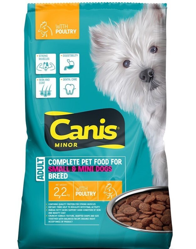 CANIS Minor visavertis maistas mažų veislių šunims ir labai mažų veislių suaugusiems šunims (1-10 kg) nuo 12 mėn. iki 7 m. amžiaus. Šio ėdalo sudėtyje yra aukštos kokybės baltymų skirtų tvirtiems raumenims ir žarnyno veiklą reguliuojančios maistinės ląstelienos. Puikiai virškinami gyvūninės kilmės baltymai ir maistinė ląsteliena padeda reguliuoti žarnyno veiklą. Omega riebalų rūgštys kartu su cinku ir B grupės vitaminais padeda palaikyti puikią odos būklę ir gražų kailį. Dėl traškios granulės sandaros ir pritaikytos formos, dydžio bei subalansuotų ingredientų maistas yra lengvai įsisavinamas.