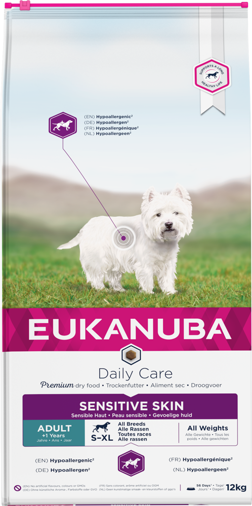 Suaugusiems visų veislių šunims su jautria oda išbandykite EUKANUBA Daily Care šunų pašarą jautriai odai