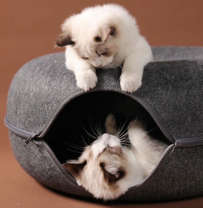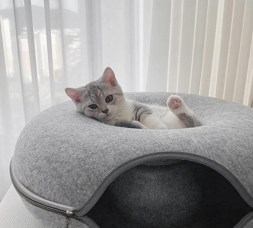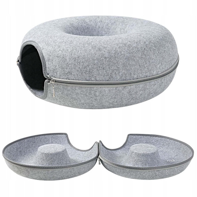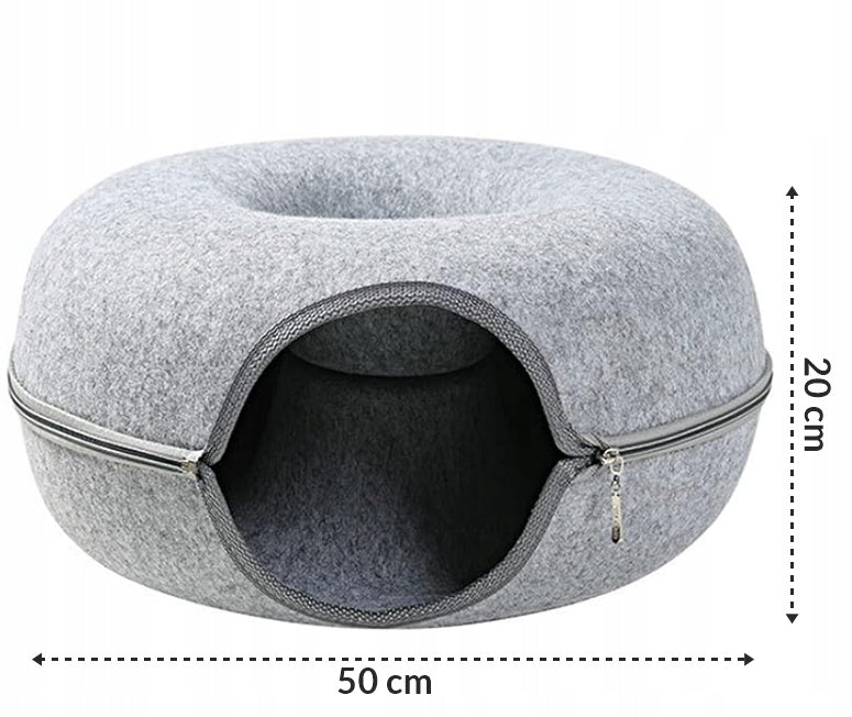 Šis unikalios formos katės guolis, puikiai tiks jūsų augintiniui, ieškančiam patogios vietos poilsiui ir žaidimams. Guolis yra su apvaliu tuneliu ir minkšta išorine medžiaga, suteikiančia jaukumo ir šilumos. Jo dizainas primena didelę, apvalią spurgą, kas suteikia guoliui žaismingumo ir originalumo.