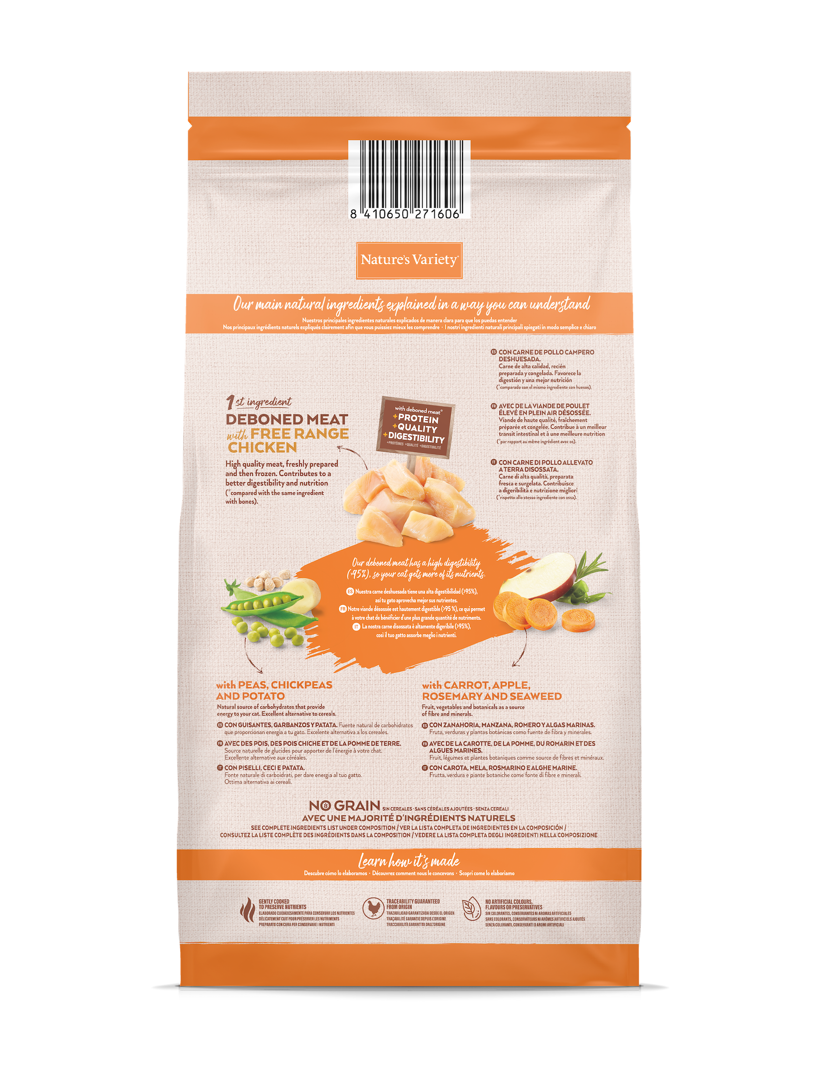 Sudėtis: Iškaulinta laisvai laikomų vištų mėsa* (30%), džiovinti vištienos baltymai (21%), džiovinti žirniai* (12%), žirnių krakmolas*, džiovinti avinžirniai* (4%),džiovintos bulvės (4%), bulvių baltymai, hidrolizuoti gyvūninės kilmės baltymai (paukštiena, kiauliena, žuvis) (3%), paukštienos riebalai* (2.5%), žirnių skaidulos*, runkelių minkštimas *, mineralai, žirnių baltymai*, džiovintos morkos* (0.5% atitinka 4% šviežių morkų), džiovinti obuoliai* (0.3% atitinka 2% šviežių obuolių), džiovinti jūros dumbliai (rudadumbliai)* (0.01%), džiovinti rozmarinai* (0.01%). *Natūralūs ingredientai.