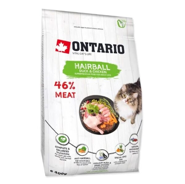 Ontario Cat Hairball sudėtyje yra vaisių, daržovių ir žolelių, kurios aprūpina augintinio organizmą vitaminais ir mikroelementais, rūpinasi katės sveikata ir gerove bei gerina jos virškinimo sistemos veiklą. Šio kačių maisto sudėtyje yra: džiovintų morkų, džiovintų obuolių, džiovintų spanguolių, džiovintų mėlynių, džiovintų špinatų, džiovintų brokolių, gysločių luobelių, rozmarinų, vynuogių, ciberžolės , citrusinių vaisių, Yucca schidigera.