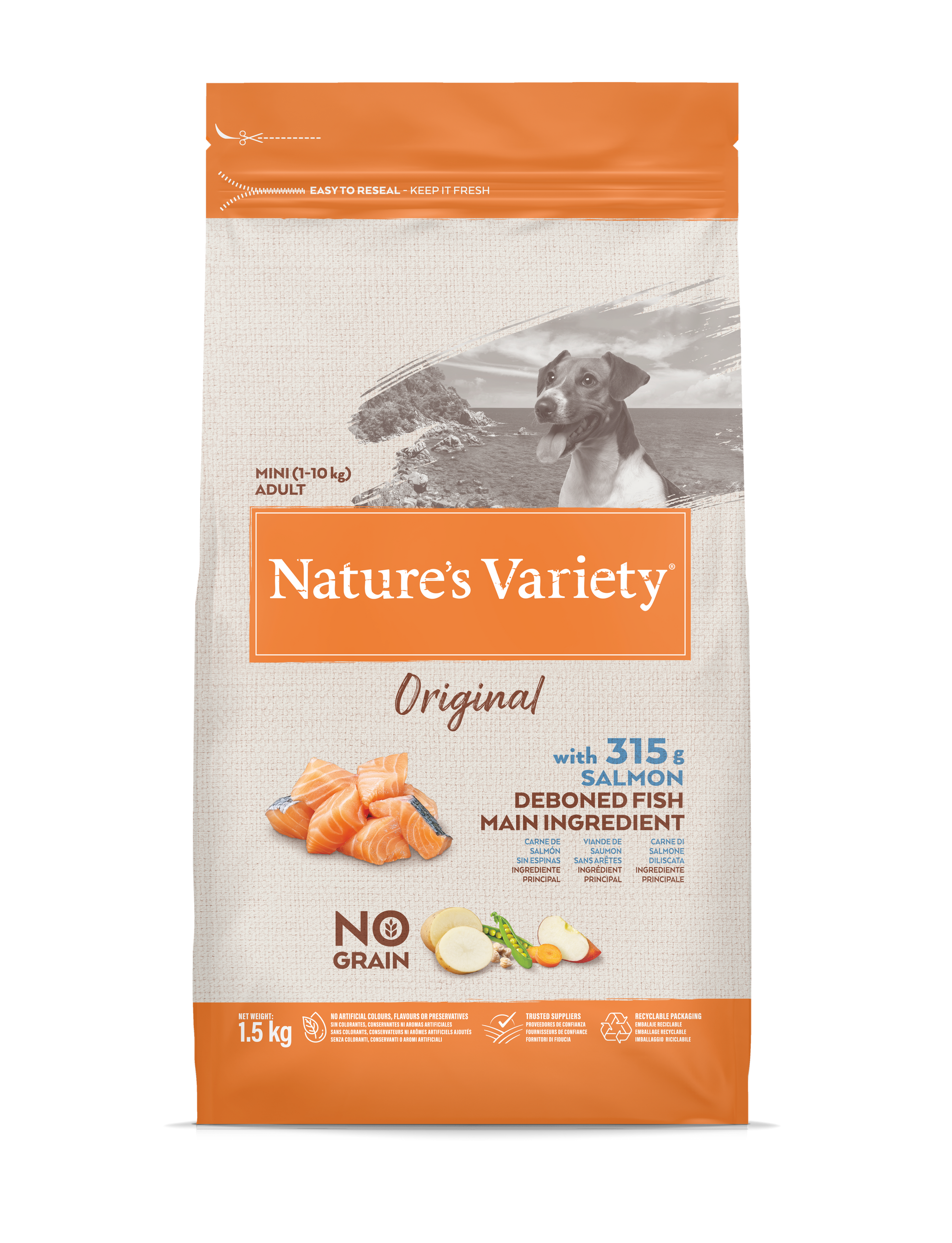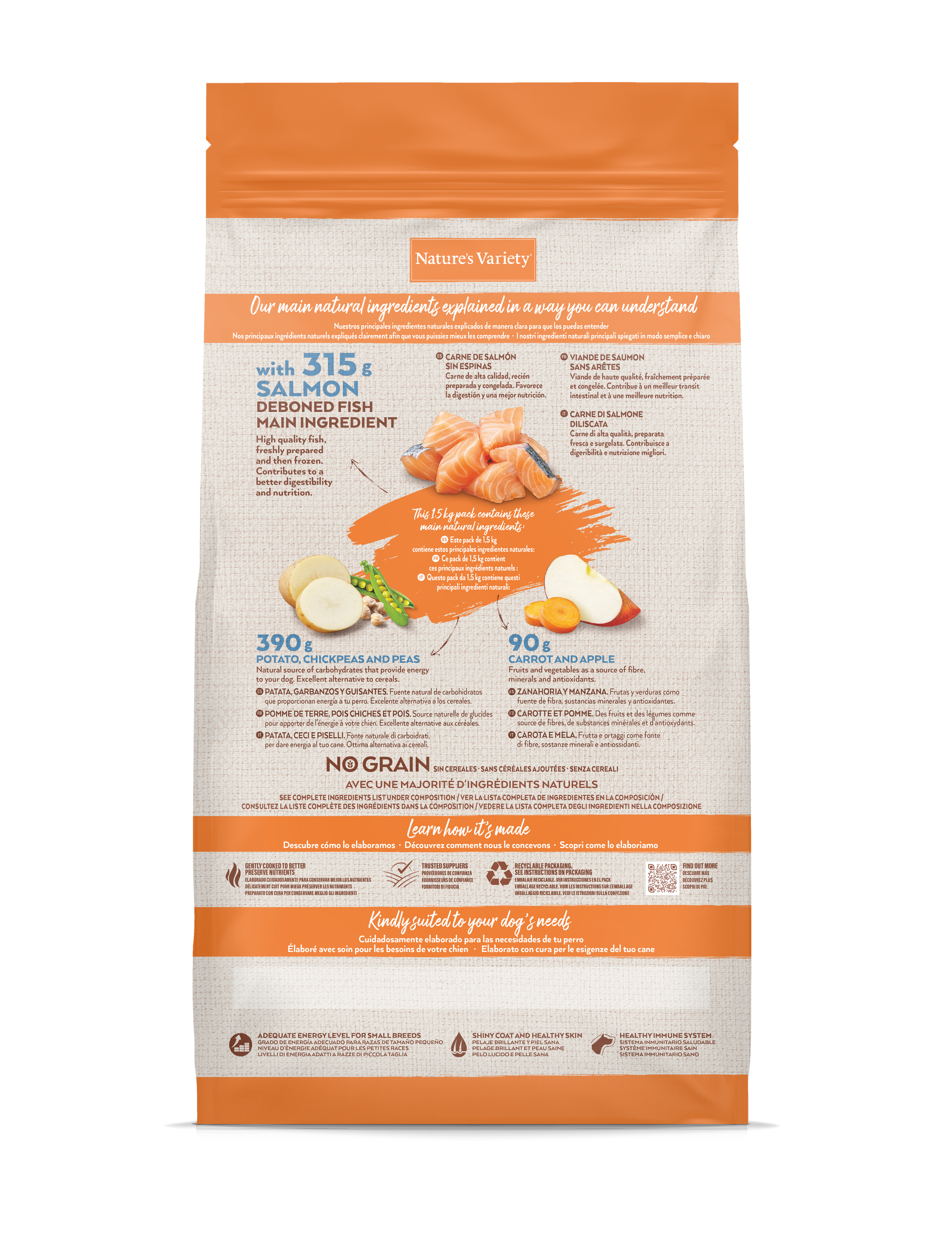 Begrūdis, pilnai subalansuotas mažų veislių šunų maistas.Iškaulinta lašiša yra pagrindinis ingredientas, kartu su kruopščiai atrinktais vaisiais ir daržovėmis bei natūraliais alternatyvių angliavandenių šaltiniais.