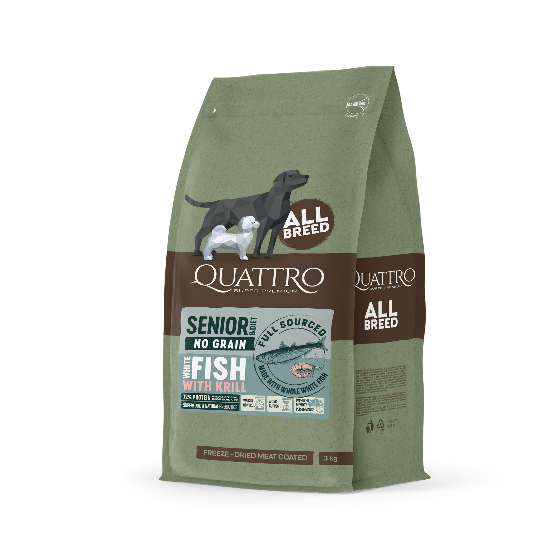 QUATTRO begrūdis visų veislių senjorų/dietinis šunų pašaras su balta žuvimi ir kriliu 3kg