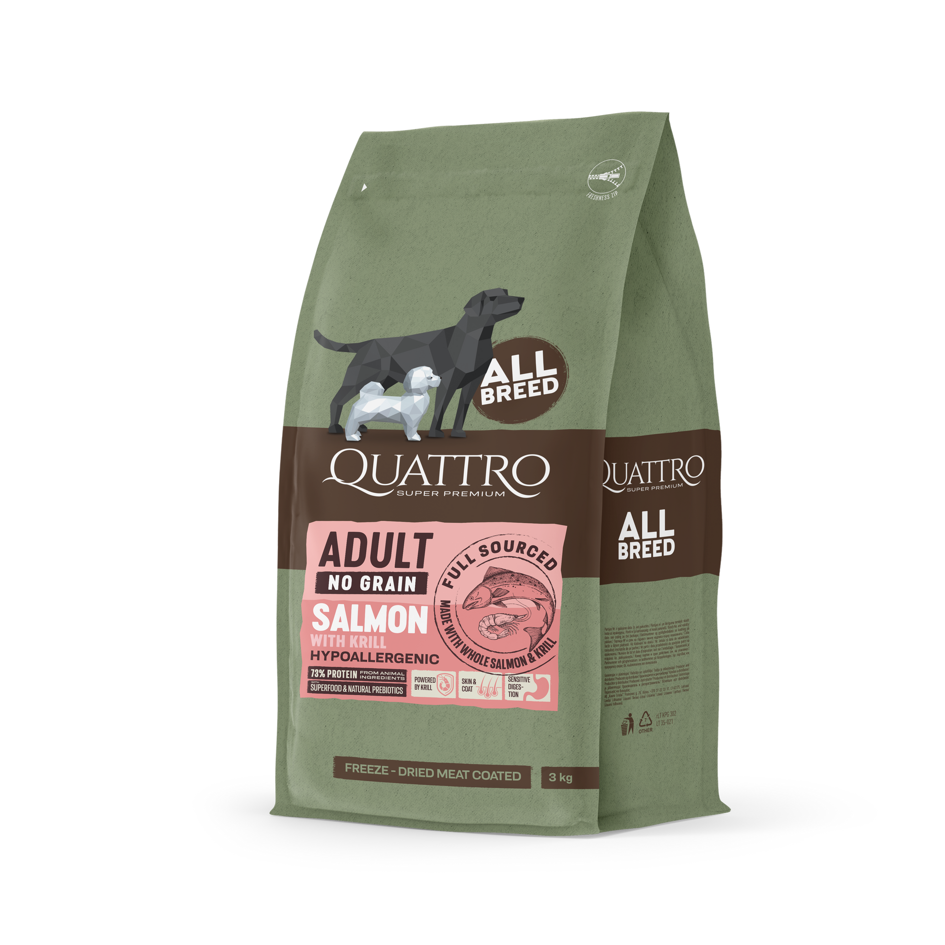 QUATTRO begrūdis visų veislių suaugusių šunų pašaras su lašiša ir kriliu 3kg