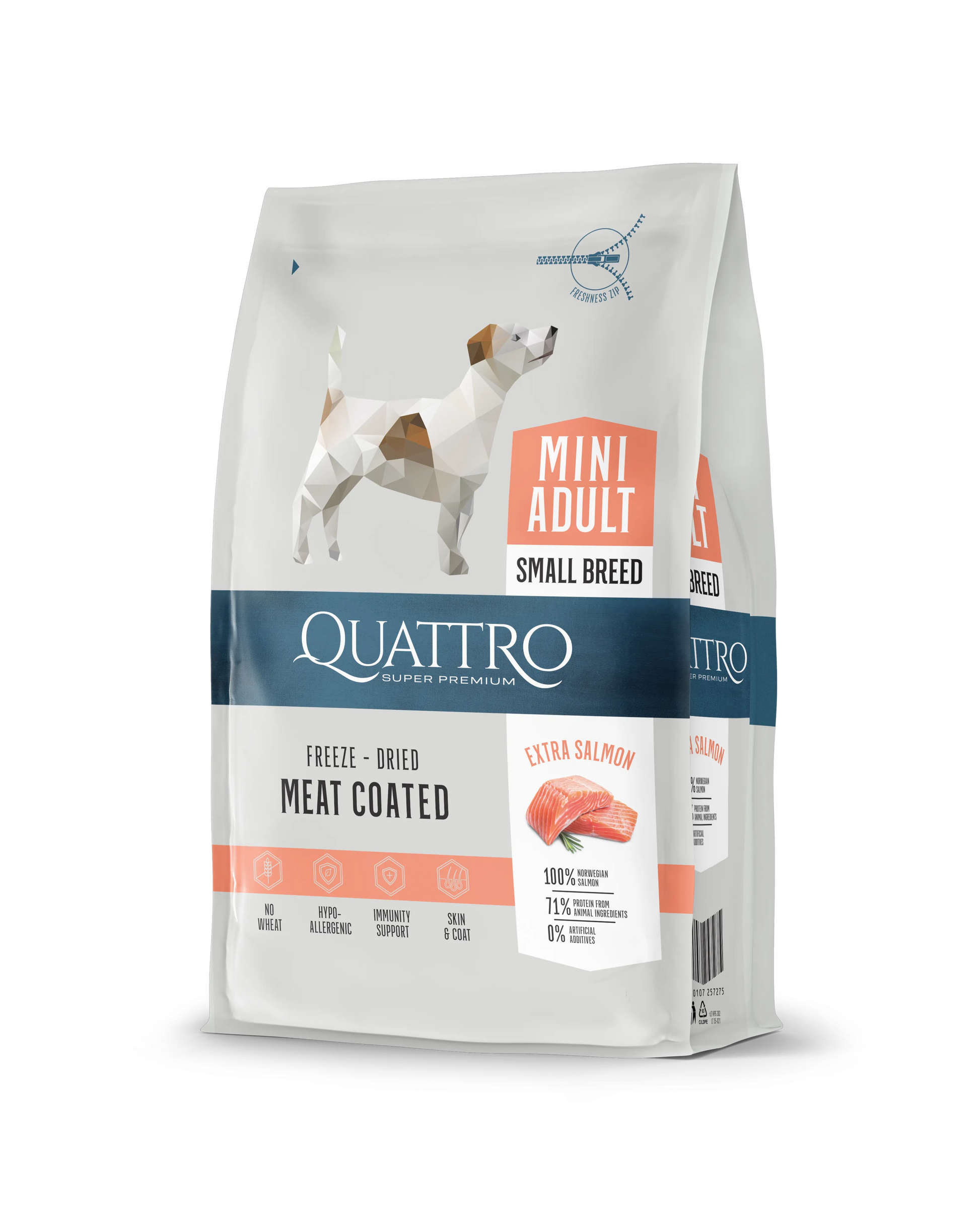 Quattro visavertis sausas pašaras suaugusiems mažų veislių šunims su daug lašišos. Suaugusio šuns svoris 1-10 kg. Šio pašaro granulė padengta šaltyje džiovinta (Freeze-dried) vištiena, kuri pašarui suteikia natūralų skonį. Šis pašaras patiks išrankiausiams keturkojams gurmanams.