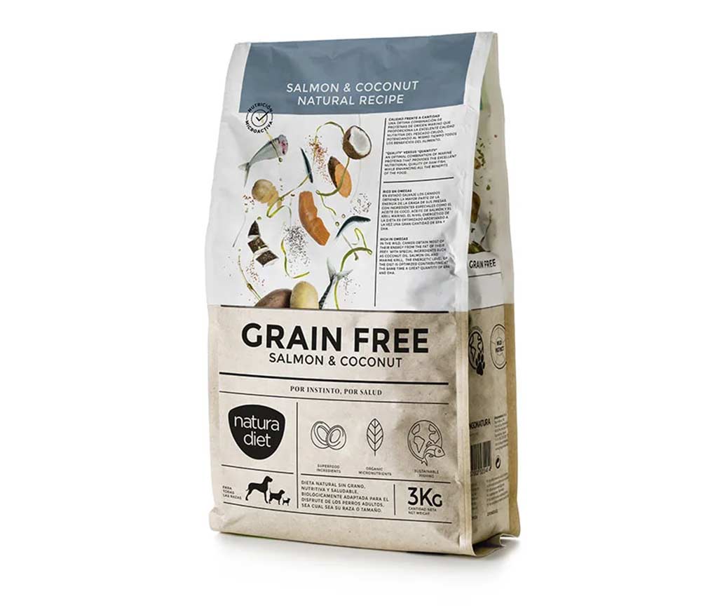 Natura Diet Grain free Salmon & Coconut biologiškai pritaikytas bet kokios veislės ar dydžio suaugusių šunų džiaugsmui. Jis ypač rekomenduojamas šunims, turintiems jautrų virškinimą arba išskirtinę dietą.