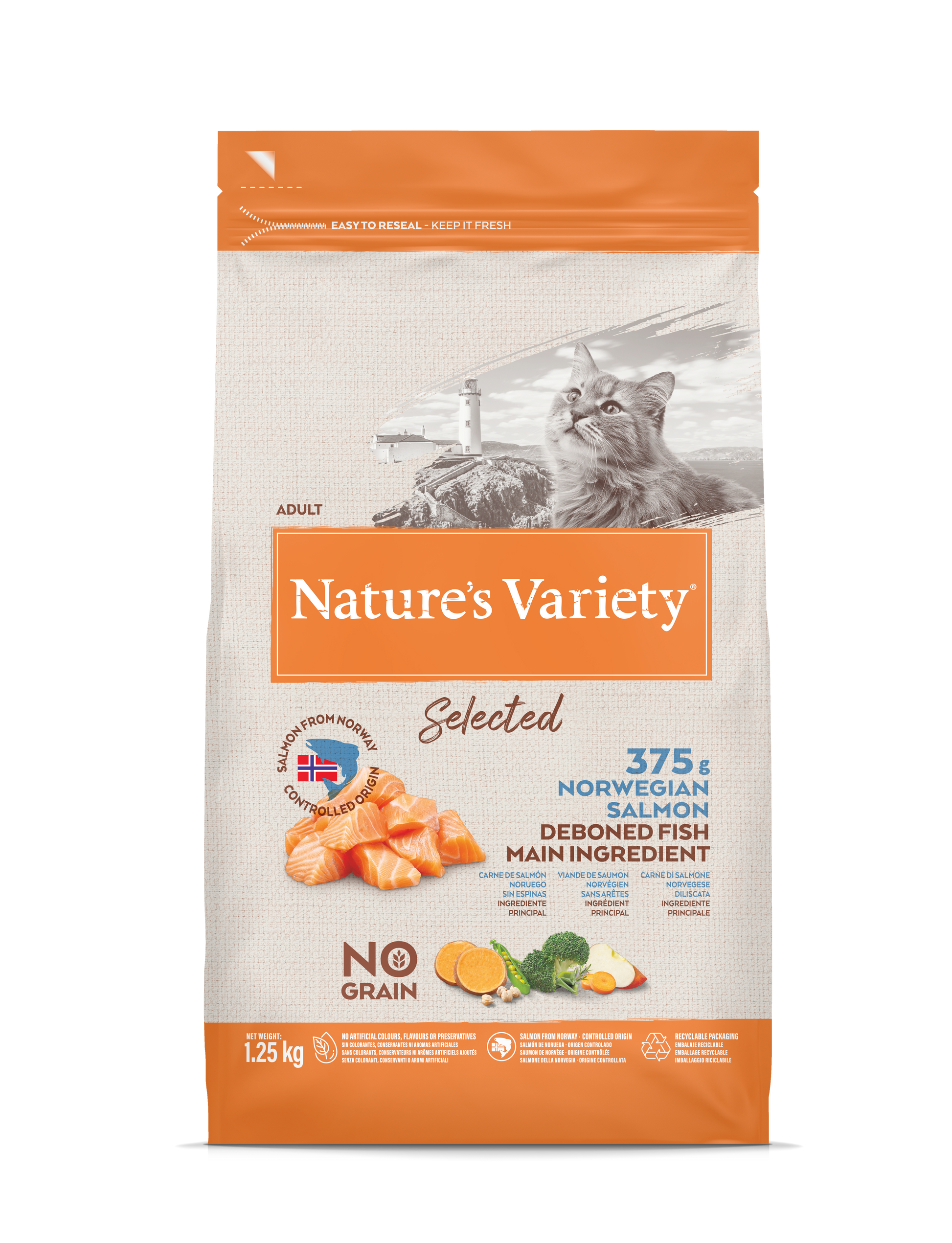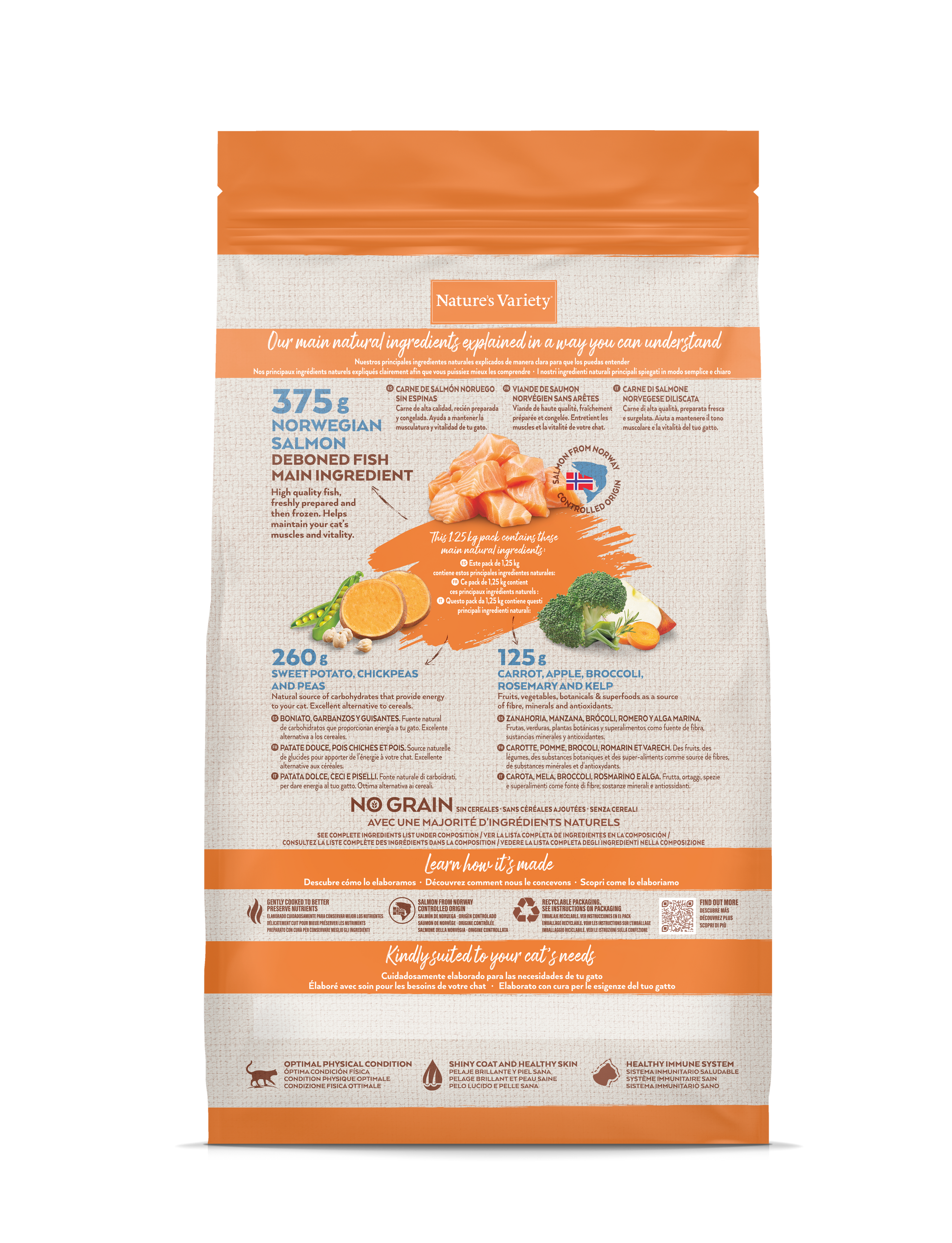 Begrūdis, pilnai subalansuotas suaugusių kačių maistas. Norvegiška lašiša yra pagrindinis ingredientas. Praturtintas vaisiais, daržovėmis, supermaistu ir natūraliais alternatyvių angliavandenių šaltiniais.