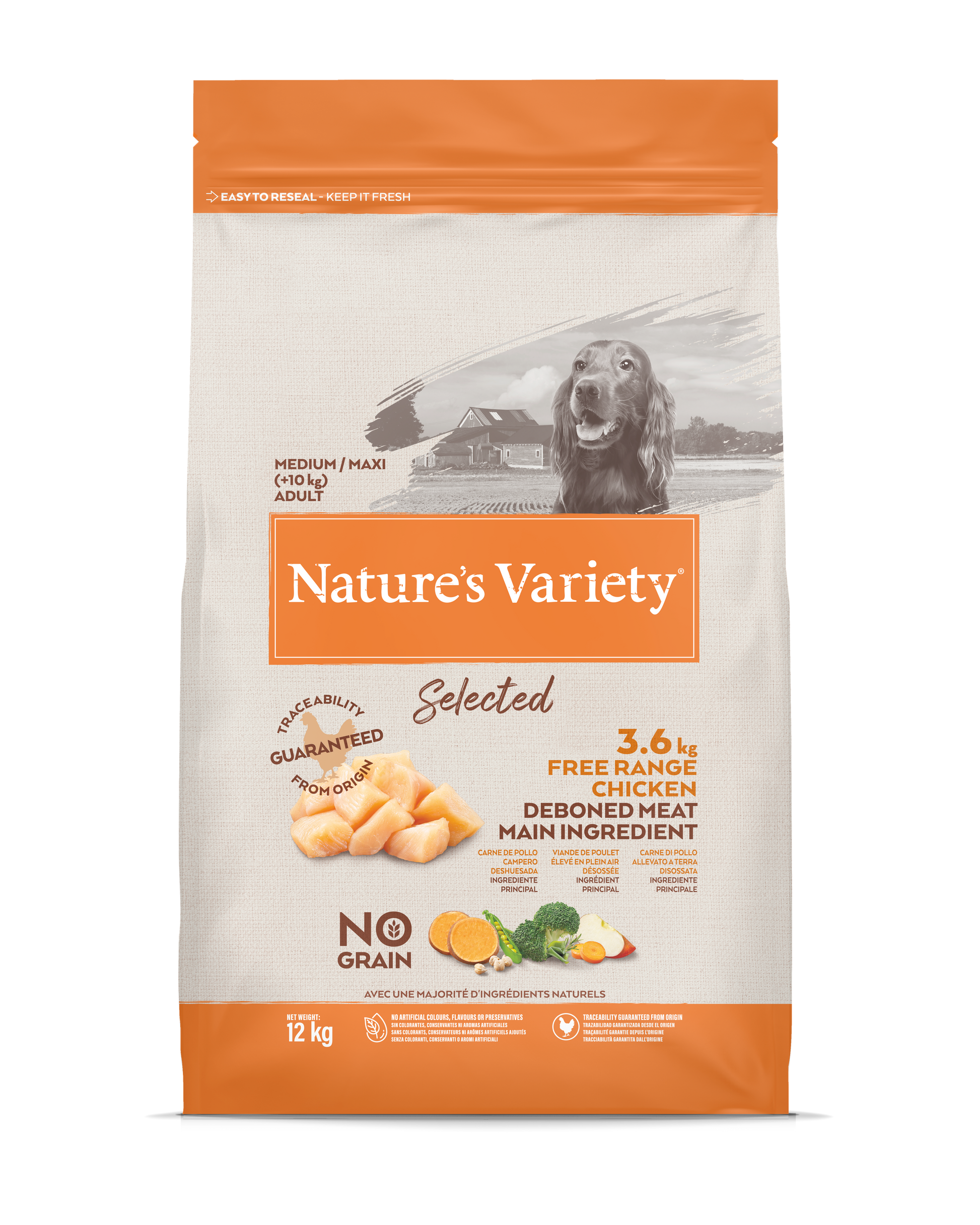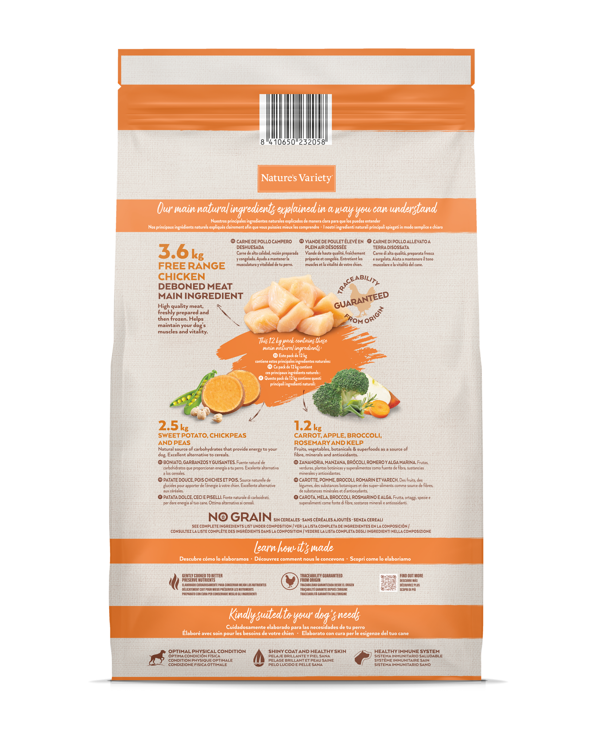 Begrūdis, pilnai subalansuotas suaugusių šunų maistas. Iškaulinta laisvai laikomų vištų mėsa yra pagrindinis ingredientas. Praturtintas vaisiais, daržovėmis, supermaistu ir natūraliais alternatyvių angliavandenių šaltiniais.