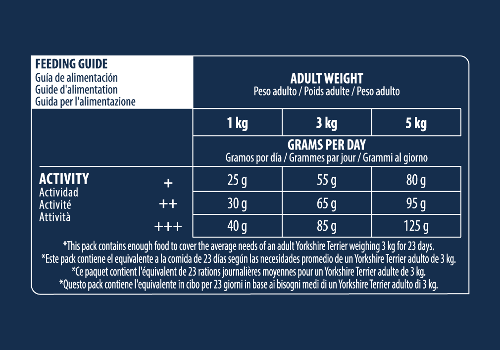 Sudėtis: Vištiena (19%), visos kukurüzų dalys, ryžiai (15%), dehidratuoti paukštienos baltymai, paukštienos riebalai, kukurūzų baltymai, dehidratuoti kiaulienos baltymai, dehidratuoti žirniai (4%), hidrolizuoti gyvūniniai baitymai (paukštiena, kiauliena, žuvis), runkelių minkštimas (2%), žirnių skaidulos, kviečių mišiniai, kviečių grüdai, cikorijų inulinas (0,8%), žuvų taukai, mineralai, kiaulienos plazmos baltymai (natūralus imunoglobulinų šaltinis) (0,4%), dehidratuotas kumpis (0,04%), dehidratuoti obuoliai (0,04%).